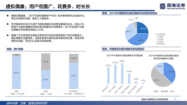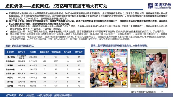(1)虚拟偶像:初音未来、洛天依等初代二次元虚拟偶像诞生于2010年后,以CG技术合成+雅马哈VOCALOID系软件合成声音,其呈现形式和商业化场景随技术进步持续丰富;字节跳动及乐华娱乐于2020年推出虚拟偶像团体ASOUL,并迅速成为顶流;燃麦科技于2021推出虚拟超写实数字人AYAYI、创壹科技于2021年推出超写实虚拟UP主柳叶熙,主要呈现形式分别为静态图片和视频。虚拟偶像盈利模式主要为演艺活动、直播带货、直播打赏及商业代言,周边衍生开发潜力大。头部虚拟偶像直播坑位费、打赏收入可比肩头部真人主播。商业代言方面,头部超写实虚拟偶像已收获10个以上的代言。据艾媒数据,2020年中国虚拟偶像核心市场规模为34.6亿元,YOY+69.3%;带动市场规模为645.6亿元,YOY+70.3%。