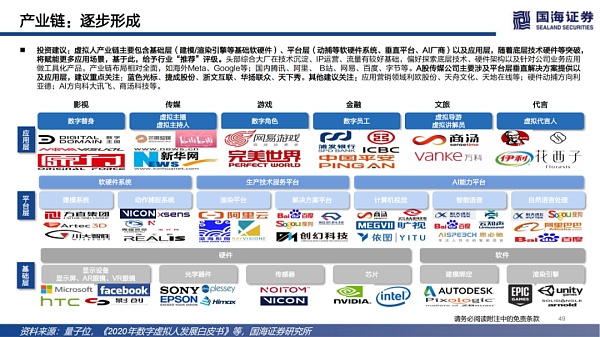 投资建议:虚拟人产业链主要包含基础层(建模/渲染引擎等基础软硬件)、平台层(动捕等软硬件系统、垂直平台、AI厂商)以及应用层,随着底层技术硬件等突破,将赋能更多应用场景,基于此,给予行业“推荐”评级。头部综合大厂在技术沉淀、IP运营、流量有较好基础,偏好探索底层技术、硬件架构以及针对公司业务应用做工具化产品,产业链布局相对全面,如海外Meta、Google等;国内腾讯、阿里、B站、网易、百度、字节等。A股传媒公司主要涉及平台层垂直解决方案提供以及应用层,建议重点关注:蓝色光标(与微软小冰合作上线“分身有术”数字人驱动平台SaaS产品;与阿里达摩院共推虚拟主播直播电商解决方案;自营/品牌定制虚拟人)、捷成股份(参股公司世优科技提供广电媒体、虚拟主播直播及虚拟场景、影视动画虚拟内容制作等多个场景的成熟技术产品和解决方案,计划推出MetaAvatarShow元宇宙分身、浙文互联(自主孵化的虚拟网红君若锦、LAN_兰,已有汽车/食品/电商等代言订单;DIGITALHUMAN平台落地;定增计划投入部分资金于虚拟数字人领域技术开发)、华扬联众(推出虚拟形象Aimee并进行商业化尝试;推出景甜、Angelababy虚拟形象)、星期六(2022年计划推出虚拟人或将作为虚拟主播参与直播带货等)、天下秀(上线网红元宇宙虚拟社交社区Honnverse虹宇宙,知名虚拟红人鱼太闲上线虹宇宙)等。其他建议关注:应用营销领域利欧股份、天舟文化、天地在线等;硬件动捕方向利亚德;AI方向科大讯飞、商汤科技等。
