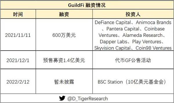 GameFi Guild 项目成立于2021-12-23,是一个加密货币主导的社区去中心化自治组织(DAO),该社区拥有较为完善的指导系统,以及赋能公会合作方、参与者相应的治理能力,会不定时的搜寻高质量的游戏项目来进行互操作并且指导公会中用户参与。其理念是帮助用户无门槛的参与Gamefi游戏,降低参与成本,同时在享受游戏乐趣时或许相应的游戏报酬来激励。