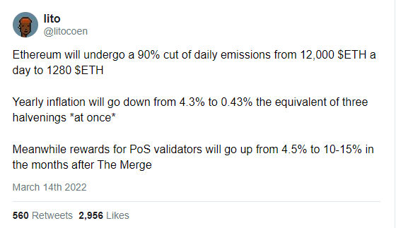 合并被戏称为「三重减半」,因为比特币需要经历三次减半才能产生同等规模的供应减少。
