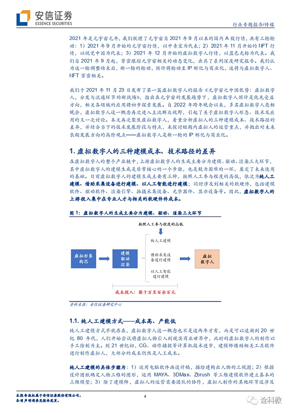虚拟数字人的三种建模成本、技术路径的差异。目前虚拟数字人的建模生成主要有三种,按照人工参与程度的高低,依次为纯人工建模、借助采集设备进行建模、以人工智能进行建模;同时涉及到相关的软硬件,包括建模软件、驱动软件、渲染引擎、拍摄采集设备、光学器件、显示设备等。1)纯人工建模方式——成本高、产能低;2)借助采集设备进行建模——成本适中、应用广泛;3)利用人工智能进行建模——成本低、技术有待提高。