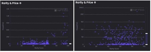 CryptoPunks和BAYC的稀有度和价格之间的关系分别如下所示。可以看出,收藏 CryptoPunks 的价值与稀有度呈正相关,越稀有越贵。而 BAYC 的收藏行为主要由会员资格驱动,因此价格与稀有度之间的关系不如前者明显。