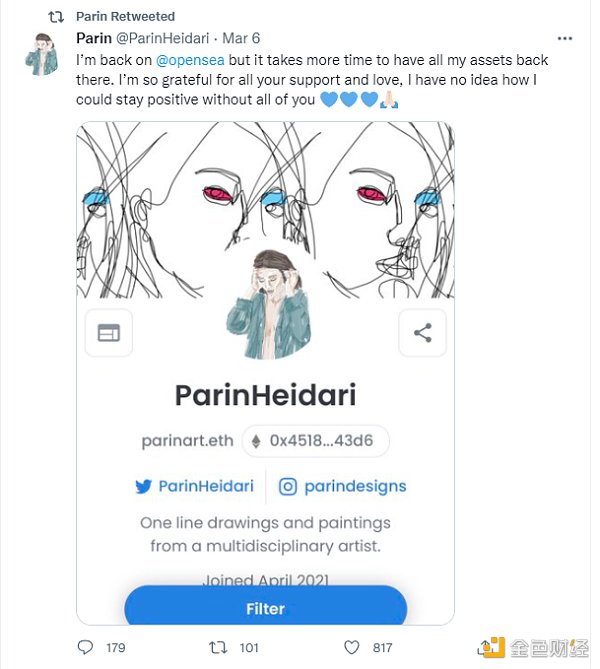 由 Parin 领头的舆论风潮很快便引起了 OpenSea 公关部门的注意,并最终恢复了她账户上的所有数据。