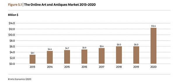 为寻求新的发展与机遇,从顶级博物馆到私人画廊,纷纷开始尝试数字化转型。短短两年,艺术品在线交易的销售额从 2019 年的60亿美元到 2020 年的 124 亿美元,占 2020 年全年市场份额的 25%,并且有持续上升的趋势。