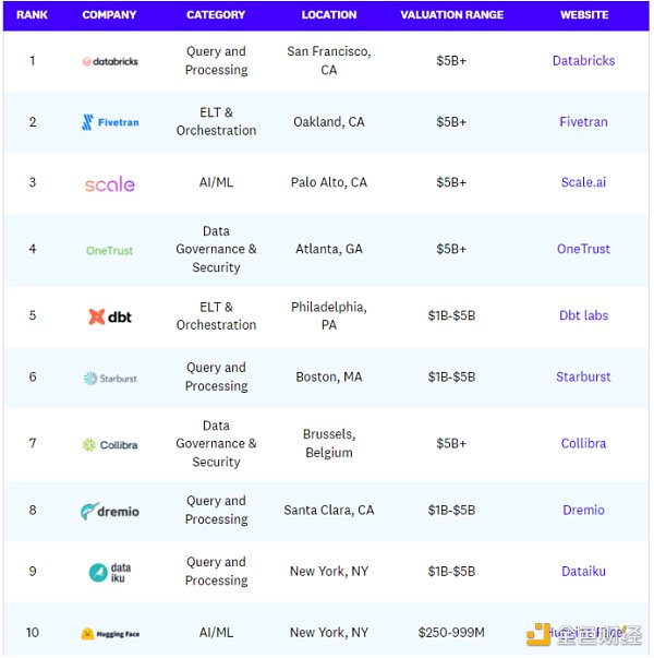 2、AI/ML(人工智能和机器学习)包括应用算法建模和机器学习处理大规模数据的软件。从上榜公司的数量来看,这一领域正在成熟和繁荣。一些参与者专注于一个特定类型的数据(例如自然语言的Rasa和Hugging Face),而另一些则专注于不同的领域,例如AI的产品化(例如 Scale、Tecton和Weights and Biases)或充当用于运行AI工作负载(例如Anyscale)的“计算层”。