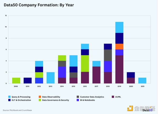 大多数 Data50 公司成立于 2014 年之后,在 AI/ML 工具爆炸式增长的推动下,在2019 年左右达到顶峰。事实上,2019 年之后成立了更多的数据公司,但是因为我们关注的是已经达到一定规模的公司,所以大多数新公司还没有出现在这个名单上。