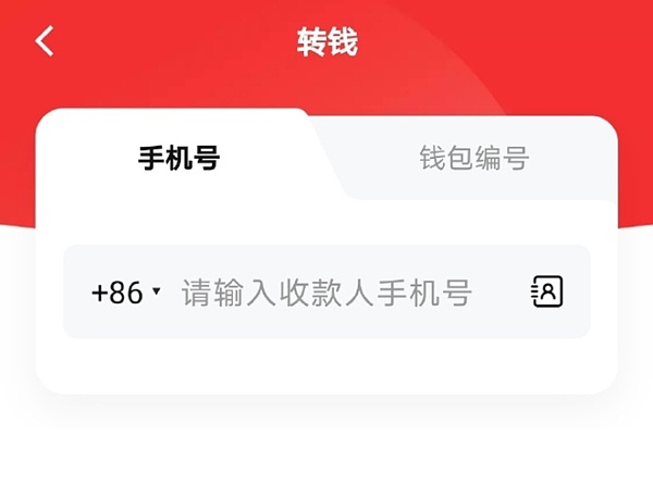 而转钱给别人,则点击上图的“转钱”,之后出现下图的界面,可以通过输入手机号或者钱包编号把钱转给别人。当然,绑定了银行卡之后也可以转出到银行卡。