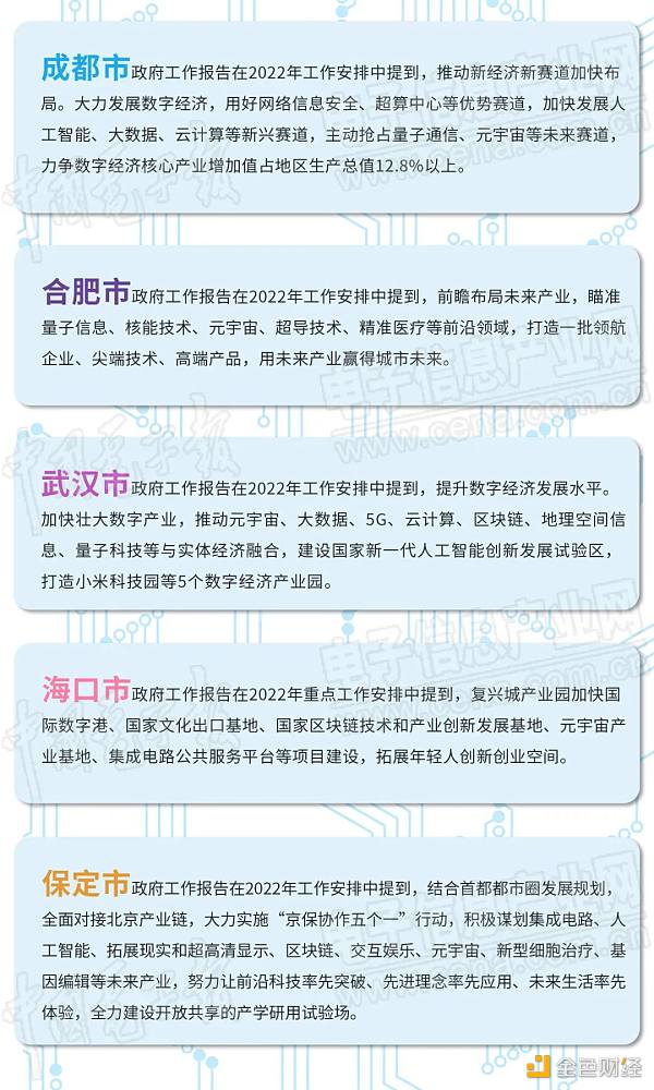 《“十四五”数字经济发展规划》明确了我国数字经济的发展目标:数字经济核心产业增加值占GDP比重要从2020年7.8%的水平上提升至2025年的10%。作为数字经济的增长点,元宇宙也成为政府积极布局的重点,成都、武汉、合肥、海口、保定以及上海市徐汇区将元宇宙写入今年政府工作报告2022年工作安排中(详情见下图)。