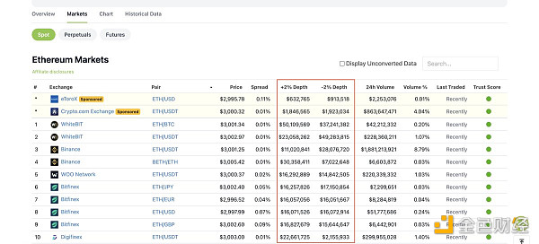 你可以在 CoinGecko? 或 CoinMarketCap 的市场(Markets)栏目下轻松查看一个代币的市场深度。在下图中,你可以通过交易所看到 ETH 的市场深度。它显示了在一个特定交易所需要买卖多少 ETH,才能推动其价格上涨或下跌 2%。