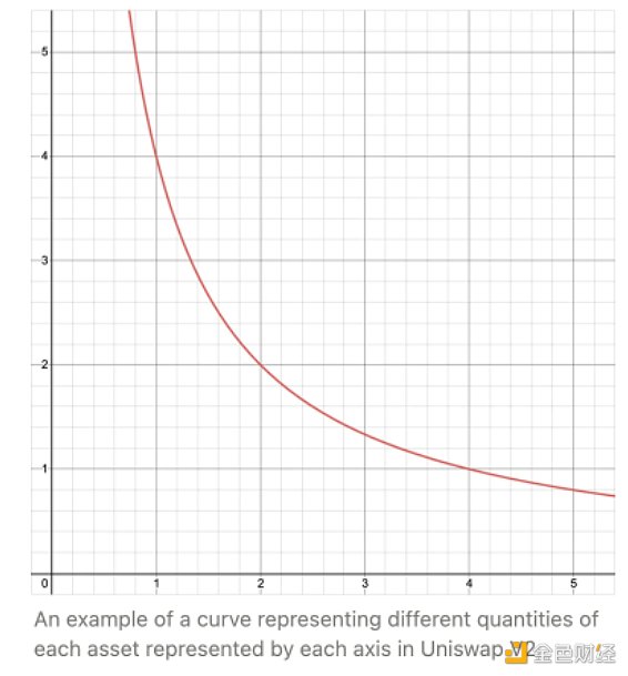 Uniswap V2中每个轴表示的每种资产的不同数量的曲线示例。