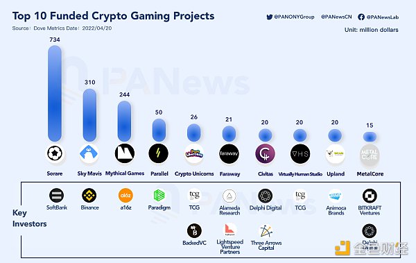 因此,PANews从众多区块链游戏的融资中梳理出了融资额前十的项目,整理了项目、融资金额、领投方的数据,制作了如下所示的图表,融资数据来源参考了PANews融资周报和Dove Metrics。本次统计以单款游戏为主,未包括Animoca Brands等具备一系列代表作的游戏制作和发行平台,但由于Sky Mavis目前只有Axie一款主打游戏,因此也在讨论之列。