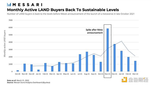 每月活跃 LAND 买家的数量回到了 Meta 在 2021 年 10 月下旬宣布之前的可持续水平。这提出了一个问题:鉴于目前只有有限的用户能够承载和货币化体验,是什么推动了 The Sandbox 虚拟世界中数字土地的价值?
