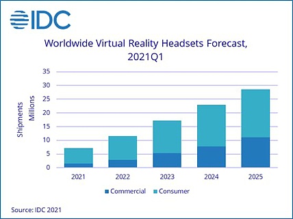据IDC数据显示,全球VR设备出货量正在提速,预计2021-2025年全球VR头显出货量将保持41%的年复合增速,预计2021年的出货量将由2020年的670万台提升到850万台,2025年更是将达到2860万台。