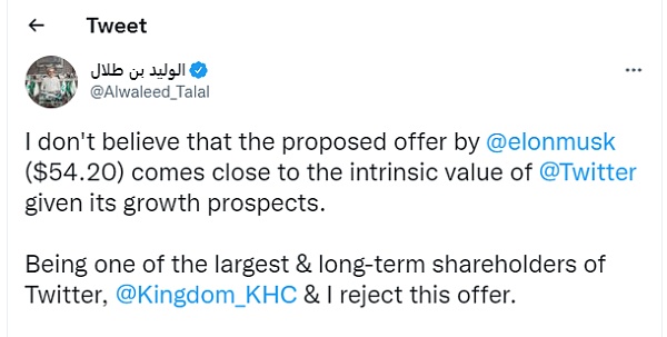 同样在今天,公司的长期投资人,沙特王子 Alwaleed bin Talal 也通过自己的 Twitter 账号发声,表示考虑到 Twitter 的长期前景,马斯克给出的$54美元价格的收购要约,并不符公司的“内在价值”(intrinsic value)。并且,他和他所代表的沙特王室控股公司?KHC 直接拒绝了马斯克的这次收购要约。