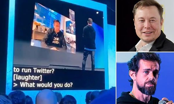 马斯克和 Dorsey 据传关系非常好,但是二人还真没怎么同框过。上图为 Twitter 公司之前的一次大会上二人视频连线对话? ?图片来源:Daily Mail