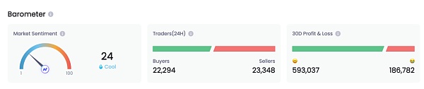 普遍来说,大约 95-99% 的交易者在市场上会亏本。或许,与大多数交易者反向交易将会获益。绿色代表买家的百分比,而红色条代表卖家的百分比。如果大多数交易者做多,市场热度空前高涨,或许可以暂时观望一下。如果大多数人预计资产价格会下跌,市场热度下降,这时候或许可以考虑买入。当比例向某一方极度偏斜时,双方账户比例趋近于最大值,这也意味着行情或将转折。