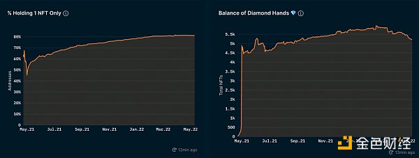 除此之外,目前持有这些 NFT 的钱包还没有卖出过的 BAYC 为 5200 个。虽然这个数字比近 6000 个 NFT 的历史最高点略有下降,但它是少数几个逐渐上升的系列之一。
