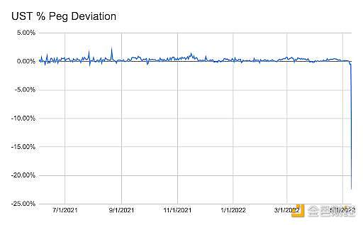 这是 UST 与其 1 美元挂钩的百分比偏差图表。与 MakerDAO 一样,0% 意味着挂钩是坚如磐石的。正如你所看到的,一切都很好,直到 UST 脱锚。