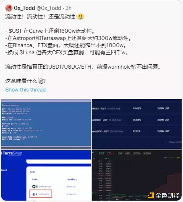 纵观全场,UST 虽然目前还有 0.8U,但是 Curve 流动性接近干涸不到 2000w,Terraswap 和 Astro 上还各剩 300w。币安,FTX 的盘口 UST、Luna 可能还有小千万的样子。