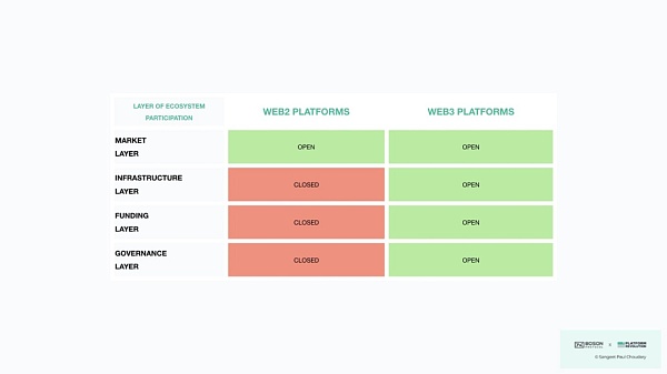 最后,Web2生态系统主要由市场参与者组成。Web3生态系统不仅需要考虑市场层的参与者,还需要考虑基础设施层、融资层和治理层的参与者。像Etsy这样的Web 2市场对第三方卖家开放,但主要是在内部创建核心市场基础设施,并集中管理资金和治理。相反,Web3商业协议需要: