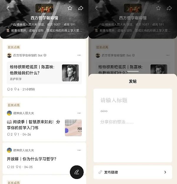 首页“识区”,类似于豆瓣小组,只有成员才能在帖子内进行评论互动,以及发布新帖子。内容包含图文和视频形式,并支持添加外部链接。