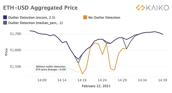 Kraken是流动性最强的美元资产服务平台之一,其报价被广泛用于加密资产参考回报的计算。如果没有异常值检测,这次闪电崩盘可能会导致价格严重扭曲,影响一系列加密服务。通过Kaiko的新异常值监测功能,我们可以从汇总的价格馈送中过滤错误数据,从而防止在闪崩期间我们可以观察到的汇总以太坊-美元对的价格(橙色)突然下跌。