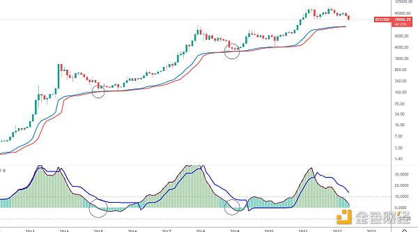 最终见大底区域一般需要快线修复至0轴一带,比如2014年熊底和2018年熊底,而目前两线依旧向下也未见拐头迹象,后面将有可能继续回落向0轴一带贴近,之前熊底一般跌至下方趋势线才会见底,前两轮熊底包括2020年3月瀑布底,而目前显然还有距离,当然随着时间推移趋势线还在上移状态,后续再观察,所以目前可能还未见底。
