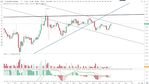 LTC自前期跌破触底反弹得上行趋势线后,回调量能并未持续放大,所以近期大幅下杀的可能性不大,近期4小时又走出了个潜在双底结构,MACD指标线金叉,目前量能是关键,只有放量突破站稳39.5美金上方,短期双底结构才会确立,不过上方面临长期周线趋势压力42美金,以及前期上行支撑转压力的趋势线双重阻力,按目前量能,直接突破的可能性不大,冲高回落的概率大些,支撑35美金。