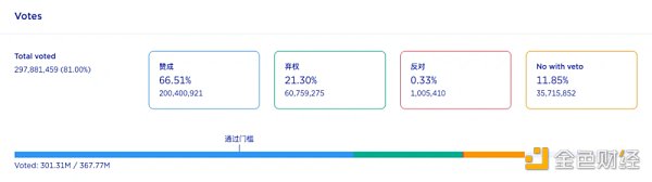 当前投票数据显示,共有 81%?LUNA 持有者对 Prop 1623 进行了投票,其中 66.51%(2 亿)支持,21.3% 弃权,0.33% 反对。根据投票规则,总票数约为 3.67 亿。根据投票规则,总票数约为 3.67 亿,50% 为通过门槛,目前 2 亿支持已经超 50%,意味着该投票已获得通过。