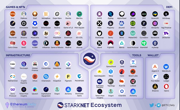 生态建设:StarkWare生态目前包含基础设施部、DeFi等多个领域,从下图我们可以看出生态中的重点项目。