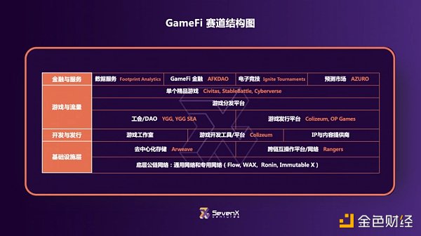 除了 DeFi,NFT、Web3、GameFi、Arweave、多链生态(Multi-chain Ecosystem)五个细分赛道都被 SevenX Ventures 以产业链的思维进行拆解。“各个细分赛道都有自己的 Mapping,我们也会基于此补充我们没有覆盖到的项目,以及提前发现天花板更高的项目。当然,这样的划分可能并不完整,我们也会尽力去完善。”