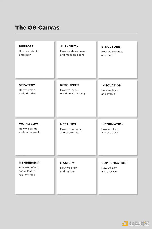 理解这 12 个领域的一种方法是,每个领域都对与组织特定方面相关的价值观和原则进行编码。操作系统的域是可组合的构建模块,DAO 工具、治理、团队、项目、产品和文化都是在此基础上建立的。通过学习操作系统的关键要素,成员可以有意识地更新和升级他们当前的系统,在持续的过程感知到问题是什么,并学习用新的操作方法来应对。