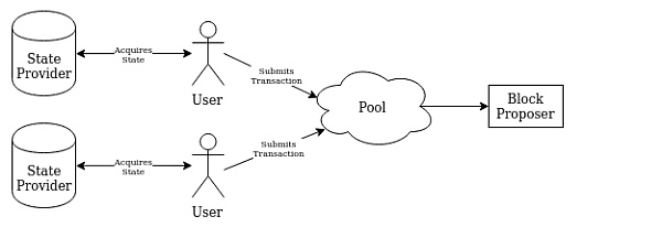 用户直接从一个或多个状态提供者处请求必要的状态,然后将带有状态的交易发往网络。节点维护待处理的交易池,每当网络产生新区块就更新见证信息。区块提议者创建区块时, 从交易池中选择待打包交易子集,包含进新的区块。