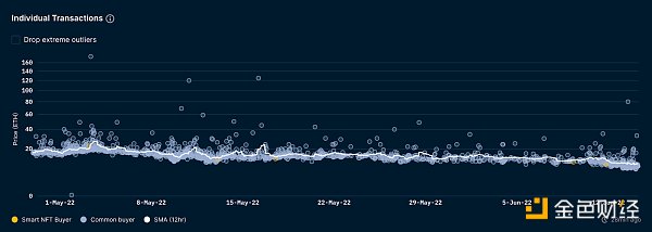 深入研究自 4 月 29 日以来的交易数据,我们发现大部分NFT的购买都来自普通买家。在过去 2 周,来自聪明投资者的地址仅完成了 2 次购买,并且购买价格接近当时的平均售卖价格。
