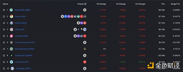 DeFi项目锁定资产前十排名及锁仓量 数据来源:defillama