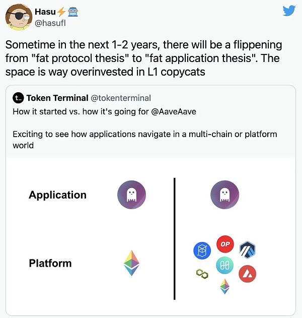 然而,我们确实需要更多的价值来渗透到加密空间的应用程序级别。也许在去中心化的世界商业模式和利润分享会比传统技术更平等。最近,一位著名的加密研究人员Hasu的帖子引发了讨论,他说我们在第1层投资太多了。他没有错。