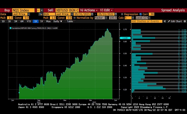 按照先后顺序,以下是比特币与前月纳斯达克100指数期货合约之间的10天、30天和90天滚动相关性图表。