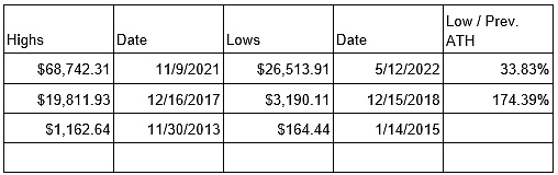 这是一张来自 glassnode 的图表,帮助我概念化了三个主要的比特币价格周期。在最大跌幅与前一个周期的历史最高点(ATH)相比,达到了一个局部底部。下面是一个代表三个主要周期的水平的表格。