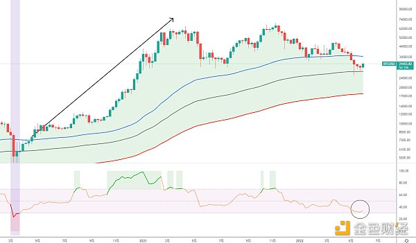 同时我们从图中可以看到,历史上熊底BTC一般需要收线至区间通道下方见红区域,2014年熊底、2018年熊底和2020年3月瀑布底均是这种走法,目前显然还有距离,所以谨防反弹后掉头下破风险。
