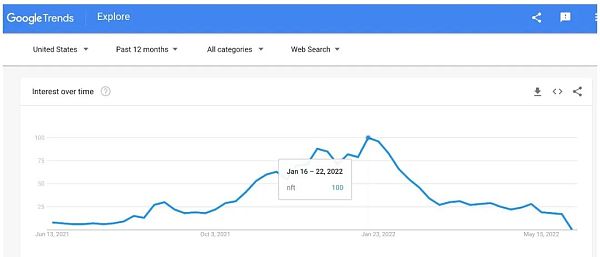 根据Google Trend的搜索数据显示,最近“NFT”的搜索热度已经从去年七月的高峰下降到了2021年1月之前的水平,侧面反映出人们对于NFT的关注热度正在急剧下降。