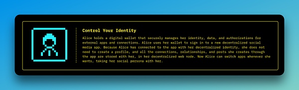 Alice 拥有一个能够安全地管理她的身份、数据以及授权信息并供外部应用或者连接使用的数字钱包。Alice 用这个钱包来登录一个新的去中心化社交媒体 app。因为 Alice 用自己的去中心化身份连接了这个 app,她不需要去创建一个新的个人资料,她在这个 app 创建的所有的连接,关系和推文都会跟随着她,存储在她的去中心化网络节点里。现在 Alice 可以随时切换 app,她的社交角色将一直跟随着她。