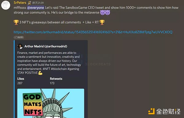 用这种「蹭热度」和「混脸熟」的方法,God Hates NFTs 社区成员在创始人 SrPeters 的带领下「骚扰」了多名 KOL。Sandbox 的 CEO Arthur Madrid 也在这份「骚扰名单」里。