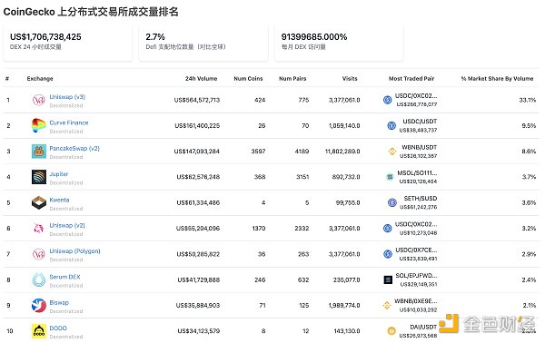 过去24小时去中心化交易所的交易量 数据来源:coingecko