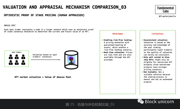 Abacus使用乐观的股权证明来创建一个有流动性支持的估值系统(见图20)。交易员通过将资金投入不同的估值池,扮演验证者的角色。NFT的可归属估值是在任何时间点锁定在池中的流动性(交易员必须将他们的美元ETH锁定在池中)。NFT值等于池中锁定的总值。
