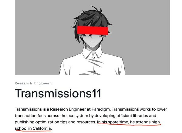 不久前,加密行业最顶尖的风投基金之一的Paradigm宣布了一位Transmissions 11的新成员的加入,值得注意的是,这名研究工程师还在硅谷上高中。