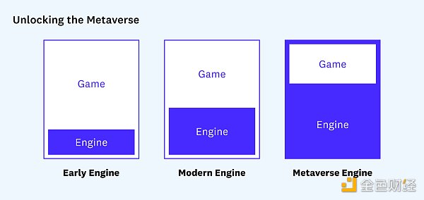 然而,在考虑元宇宙时,引擎扮演着更重要的角色。为了打破将一款游戏或体验与另一款游戏或体验隔开的墙,游戏可能会被封装并托管在引擎中,而不是相反。在这个扩展的视图中,引擎变成了平台,这些引擎之间的通信将在很大程度上定义我所认为的共享元宇宙。