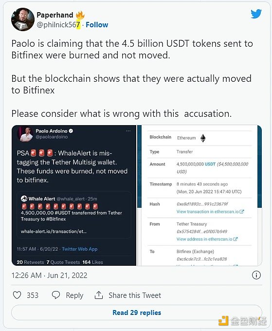 一位 Tether 发言人称在 6 月 22 日的前 24 小时里,Tether 稳定币交易量高达 480 亿美元,而 USDC 交易量只有约 50 亿美元,从这个角度来看,Tether 的实用性更强,尽管市值出现下降,但其实恰恰证明了 Tether 储备近性完全能够满足流动性赎回需求。该发言人还表示,Tether 并不想迎合传统的银行业,而是想专注成为一种用于 P2P 交易、汇款、和对冲通胀的自由化工具,这就是为什么在过去几周 Tether 市值受现金赎回影响而有所下降的原因。总体来看,即便 USDT 市值出现下跌,但 24 小时交易量仍比 USDC 高出了 9 倍多。
