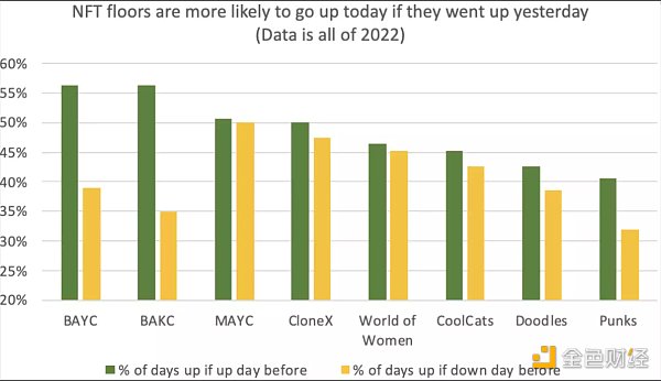 NFT 是动量资产,如果昨天地板价上涨,今天就有更大几率上涨。不过,NFT 地板价大多数时候都将下跌。