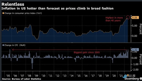 美国劳工部发布的数据显示,美国 6 月份消费者价格指数同比上涨 9.1%,创下40年来的新高,并显示整个经济体的通胀压力正在扩大。