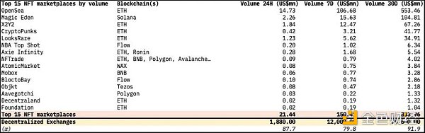 尽管NFT在2021年和2022年初表现活跃,但与DeFi相比,NFT交易活动的水平只能说还好。前15家NFT市场占据了全球NFT市场的绝大多数份额,但其总交易量还不到去中心化加密货币交易所的2%,更不用说2021年交易量高达14万亿美元以上的中心化交易所了。